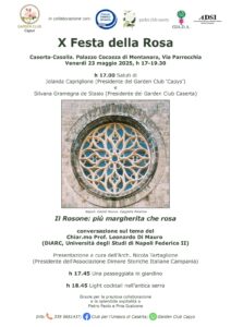 “ E dimmi, mentre passeggi in questa città, ti sei accorto che i palazzi … ebbene, alcuni sono muti, altri parlano e altri poi, i più rari, cantano?”. Diciamo la verità: chi non correrebbe a cercare il ‘palazzo che canta’ dopo questa dichiarazione del poeta Paul Valéry in Eupalinos ou l’architecture? Io l’ho fatto e l’ho trovato e, infatti, lo splendido Palazzo Cocozza di Montanara accoglie quest’anno la Decima Festa della Rosa organizzata dal Garden Club ‘Capys’. E’ una festa girovaga, ma puntuale: a maggio ci incontriamo, appunto, per ‘far la festa’ a questo fiore dai cento e cento volti, forme e colori, ma che appartiene di diritto alla nostra storia più antica, più profonda.