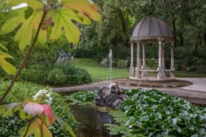 Il giardino ha visto l’intervento di Peter Curzon, Fabrizio Fusco, ma anche i preziosi suggerimenti di Nicola Tartaglione che hanno ridato nuova vita a quest’area con nuove piante, nuovi fiori a fare skyline, limiti, bordure, macchie di bellissimi colori e intensi profumi, dalla lavanda al glicine alle rose. Alte e solenni svettano le palme a ‘protezione’ delle delicate camelie, ma anche degli agrumi che qui hanno di che essere felici. Ma fra i limoni e i mandarini s’intrecciano rose variopinte, e non poteva essere altrimenti perché la rosa, in un giardino degno di questo nome, la rosa è inevitabile. Perché? Non si sa, come scriveva Giorgio Caproni: “Buttate pure via/ogni opera in versi o in prosa./Nessuno è mai riuscito a dire/cos’è, nella sua essenza, una rosa”
