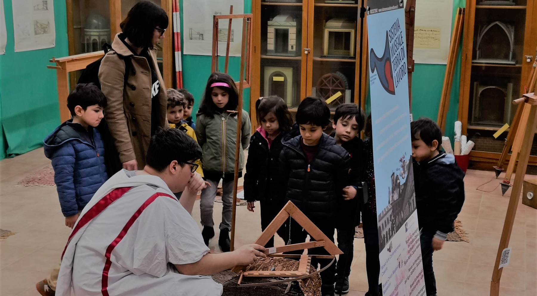 sezione di storia del disegno: pannelli con riproduzioni di disegni storici, ricostruzione dello studio di un geometra, tavole dell’ing. Scarnati, pannelli schizzi e progetti di Vanvitelli per la Reggia di Caserta;